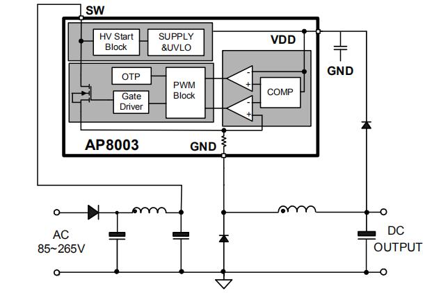 ¡¡¡¡AP8003·Ç¸ôÀë½»Ö±Á÷ת»»Ð¾Æ¬¼¯³ÉPFM¿ØÖÆÆ÷¼°500V¸ß¿É¿¿ÐÔMOSFET£¬ÓÃÓÚÍâΧԪÆ÷¼þ¼«¾«¼òµÄС¹¦ÂʷǸôÀ뿪¹ØµçÔ´¡£AP8003ÄÚÖÃ500V¸ßѹÆô¶¯£¬ÊµÏÖϵͳ¿ìËÙÆô¶¯¡¢³¬µÍ´ý»ú¹¦ÄÜ¡£¸ÃоƬÌṩÁËÍêÕûµÄÖÇÄÜ»¯±£»¤¹¦ÄÜ£¬°üÀ¨¹ýÔØ±£»¤£¬Ç·Ñ¹±£»¤£¬¹ýα£»¤¡£ÁíÍâAP8003·Ç¸ôÀë½»Ö±Á÷ת»»Ð¾Æ¬¾ßÓÐÓÅÒìµÄEMIÌØÐÔ¡£