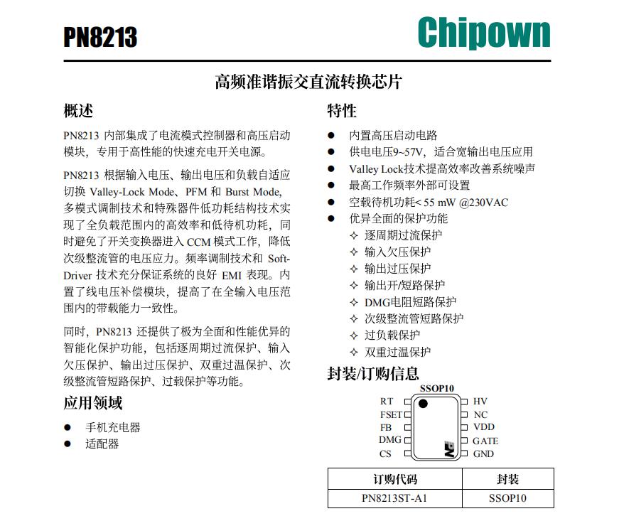 ¡¡¡¡PN8213ʵÏÖÕæÕýQR-Lock¼¼Êõ£¬»·Â·¸ß¶ÈÎȶ¨£¬½ø¿ÚÌæ»»µÄÊÊÅä¶È¸ü¸ß£¬×î¸ßÖ§³Ö500kHz¹¤×÷ƵÂÊ£¬¼õС±äѹÆ÷¼°Êä³öµçÈÝÌå»ý£»µäÐÍת»»Ð§ÂÊ´óÓÚ93%£¬ÌáÉý³äµçÆ÷¹¦ÂÊÃܶȡ£