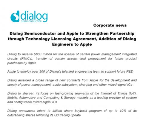¡¡¡¡DialogÊÇÒ»¼Ò×ܲ¿Î»ÓÚÓ¢¹úµÄÐ¾Æ¬ÖÆÔìÉÌ£¬×Ô´ÓµÚÒ»¿îiPhoneÎÊÊÀÒÔÀ´£¬¾ÍÒ»Ö±ÓëÆ»¹ûºÏ×÷£¬¸ù¾ÝЭÒ飬ƻ¹û³ýÁËÐèÒªÖ§¸¶3ÒÚÃÀÔªµÄǰÆÚÊÕ¹º£¨°üÀ¨300ÃûÑз¢¹¤³ÌʦºÍÓ¢¹ú¡¢Òâ´óÀû¼°µÂ¹úµÈµØÇø°ì¹«ÊÒÔÚÄÚµÄDialog²¿·Ö×ʲú£©×ʽðÖ®Í⣬ͬʱÐèÒªÔ¤¸¶3ÒÚÃÀÔª×÷ΪºóÐø²É¹ºDialog²úÆ·µÄÔ¤¸¶¿î£¬°üÀ¨µçÔ´¹ÜÀí¡¢ÒôƵ×Óϵͳ¡¢³äµçºÍÆäËû»ìºÏÐźÅICµÄ¿ª·¢ºÍ¹©Ó¦¡£